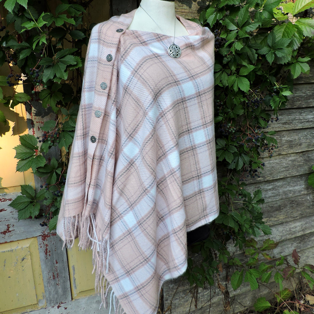 These amazingly soft cashmere blend Button Shawls feature a bullion fringed hem and authentic pewter buttons, made exclusively for us by Atlantic Pewter.