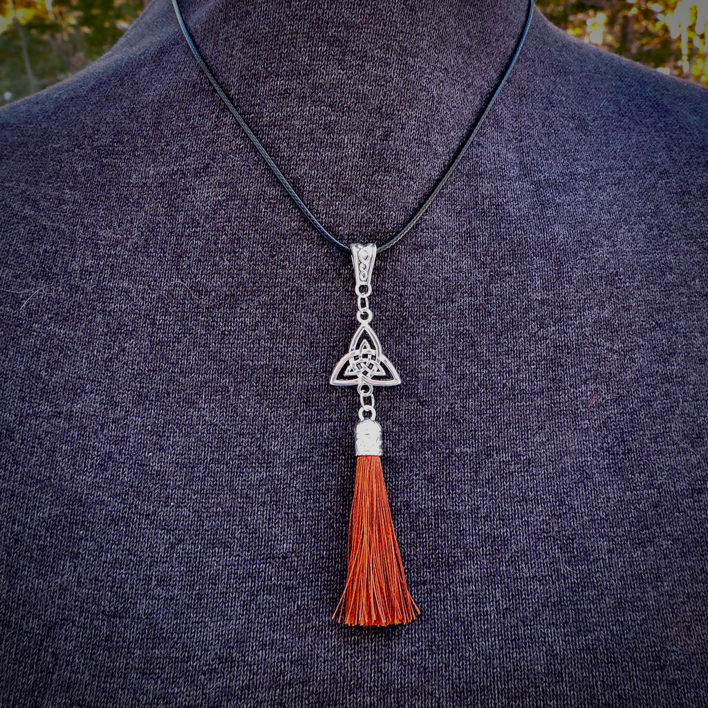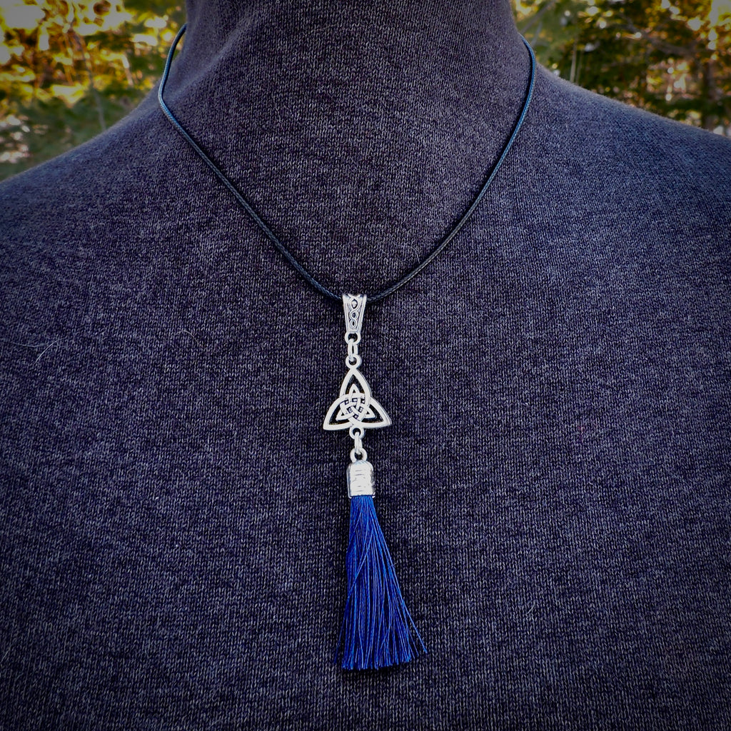 Simple Celtic knot pendant with tassel on a black cord.