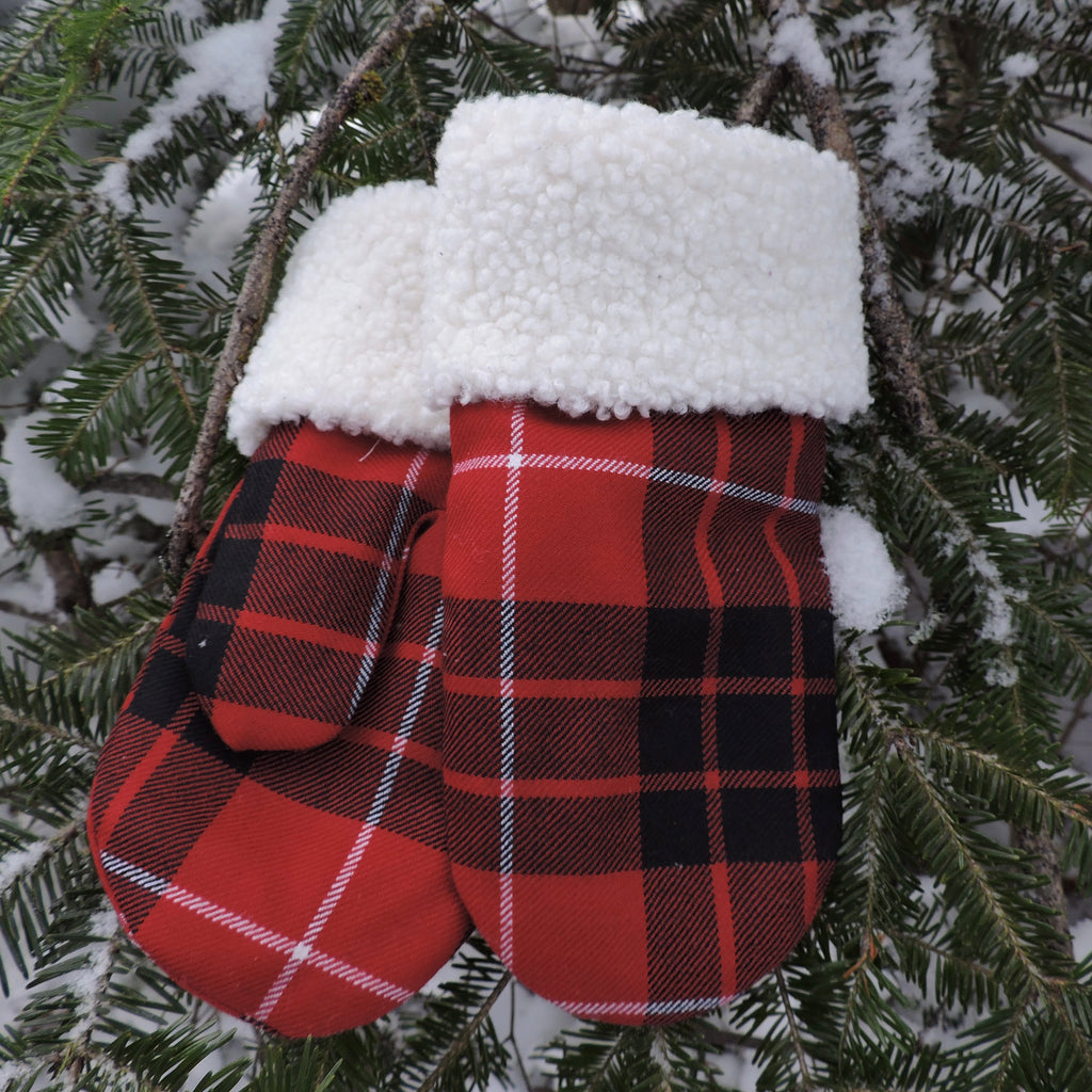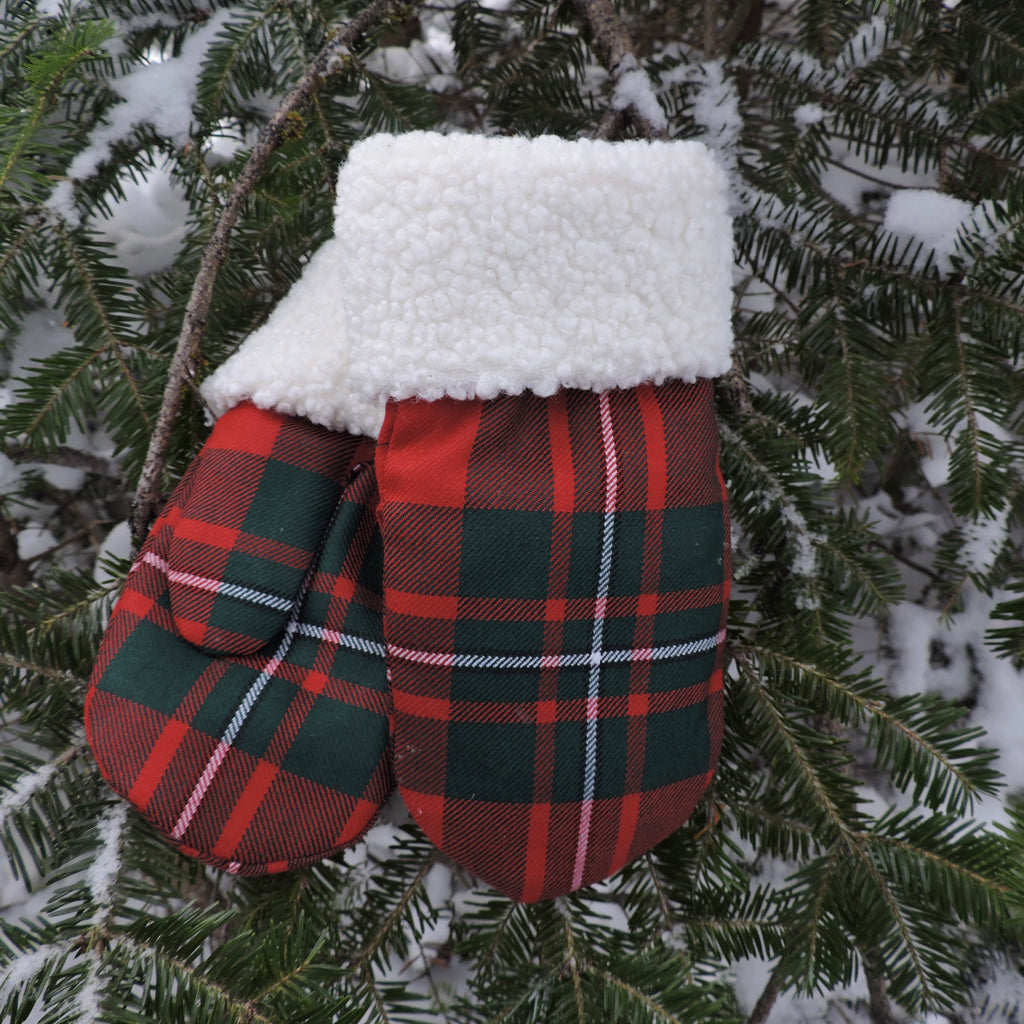 These mittens have a heavy brushed finished coating fabric for the liner, which is warm and soft on the skin, and a roll up sherpa or rib-knit cuff. The cuff can be worn down or rolled up and tucked in for particularly blustery days. The tartans are a fine 100% wool woven in Scotland.